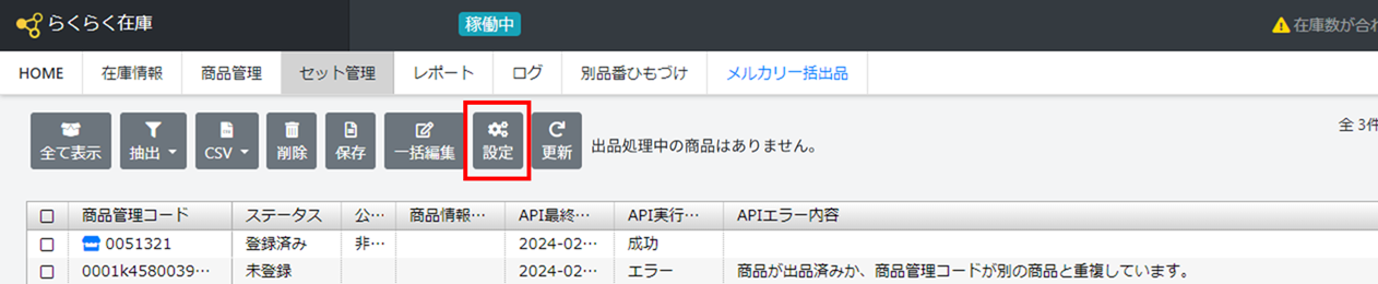 らくらく在庫管理画面>メルカリ一括出品> 設定を選択します。