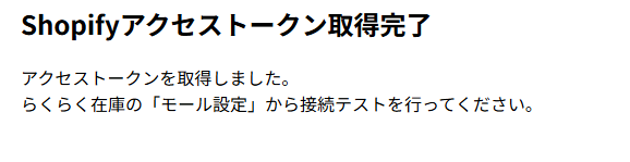 Shopifyアクセストークン取得完了という画面が表示されます。