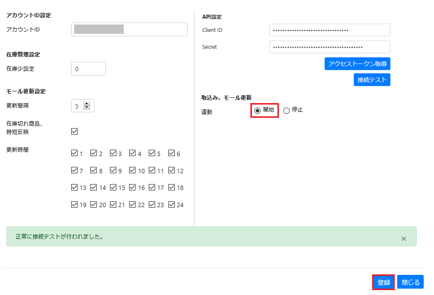 取込み・モール更新を連動開始にチェックし、「登録」ボタンをクリックします。